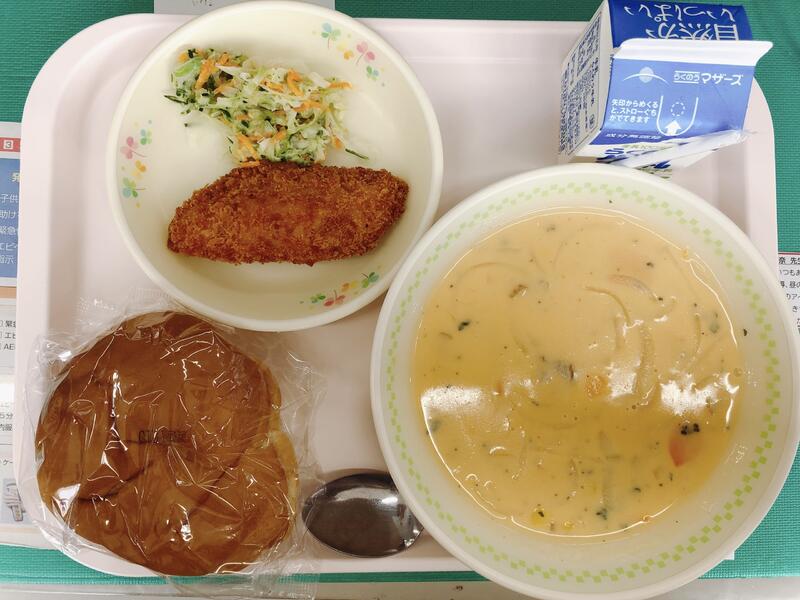 10月27日の給食は「ご飯、牛乳、白菜のジンジャスープ、かぼちゃひき肉フライ、カロテンサラダ、かぼちゃプリン」でした。