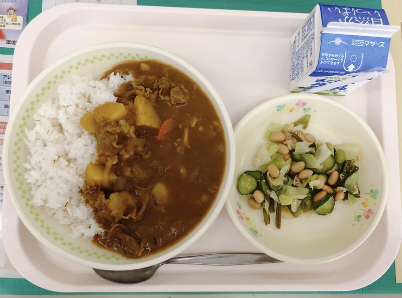 10月12日の給食は、「カレーライス、牛乳、まめまめサラダ」でした。
