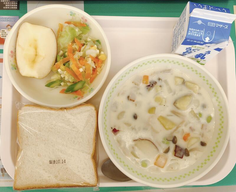 10月15日の給食は「食パン、牛乳、秋の風香るシチュー、イタリアンサラダ、りんご」でした。