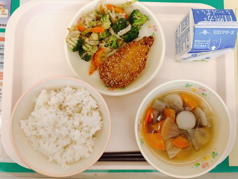10月26日の給食は「麦ご飯、牛乳、たぬき汁、あじゴマフライ、ブロッコリーのおかか和え」でした。