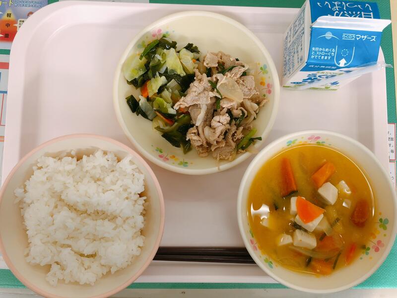11月16日の給食は「ごはん、牛乳、みそ汁、豚肉の生姜焼き、わかめの酢の物」でした。