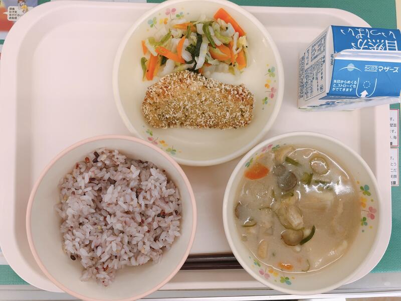 11月19日の給食は「古代米入りごはん、牛乳、お姫さん団子汁、ホキ天玉揚げ、ゆずの香和え」でした。