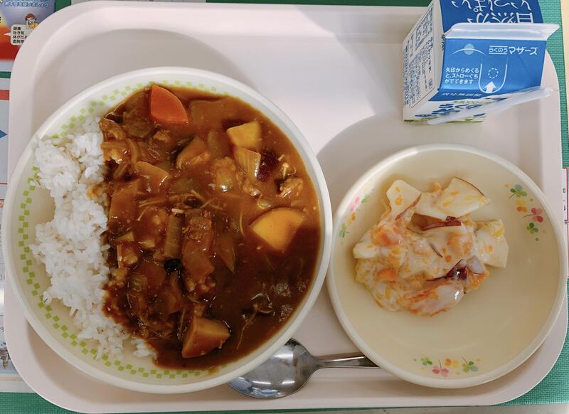 11月24日の給食は「森のきのこカレー、牛乳、ヨーグルトあえ」でした。