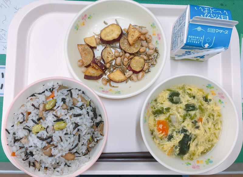 11月26日の給食は「ひじきごはん、牛乳かきたま汁、ミックスカリントウ」でした。