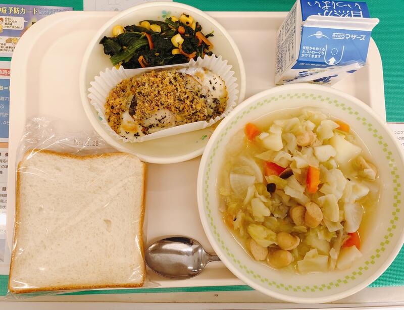 11月29日の給食は「食パン、牛乳、ポトフ、魚のハーブパン粉焼き、ほうれん草とコーンのソテー」でした。
