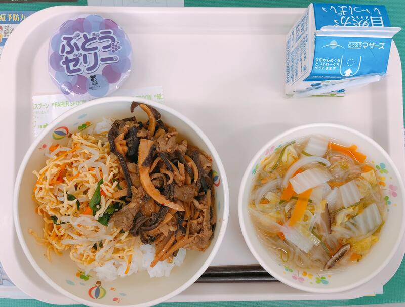 11月30日の給食は「ビビンバ、牛乳、春雨スープ、ぶどうゼリー」でした。