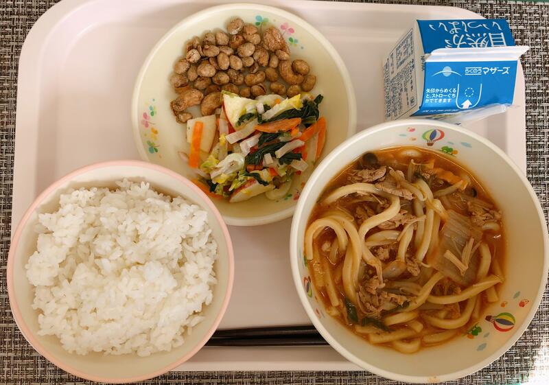 1月31日の給食は「ごはん、牛乳、キムチ鍋うどん、白菜とりんごのサラダ、りんかけ豆」でした。