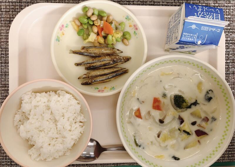 1月28日の給食は「ごはん、牛乳、あったか冬野菜シチュー、きびなごのから揚げ、まめまめサラダ」でした。