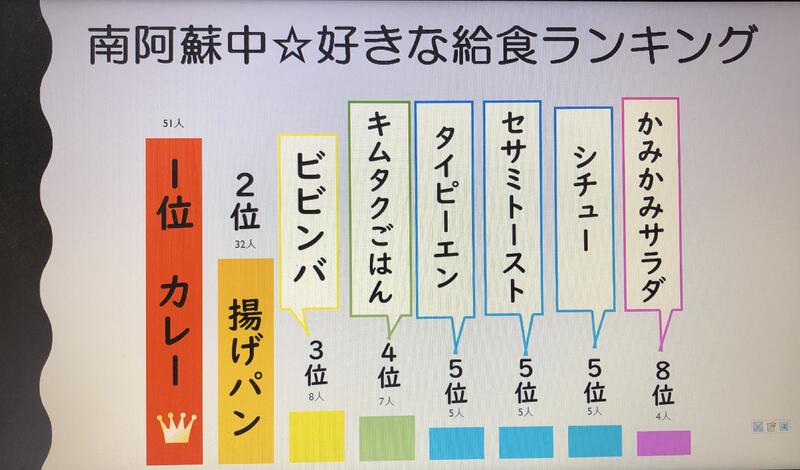 今日は『好きな給食ランキング』『先生方の給食の思い出』南阿蘇中編などの内容のスライドショーを流しました。