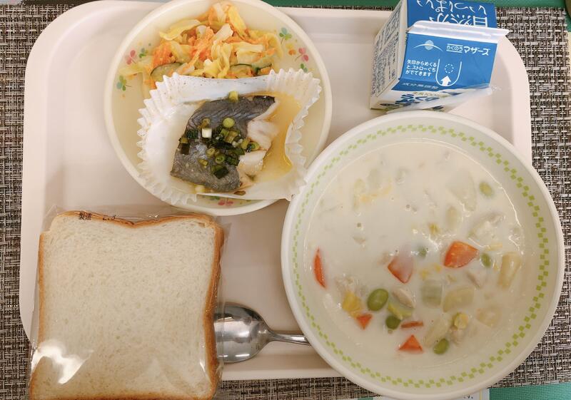 2月4日の給食は「食パン、牛乳、白菜のミルクスープ、白身魚の香味焼き、チーズ入りサラダ」でした。