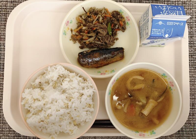 2月14日の給食は「麦ごはん、牛乳、味噌汁、いわしの梅煮、きんぴらごぼう」でした。