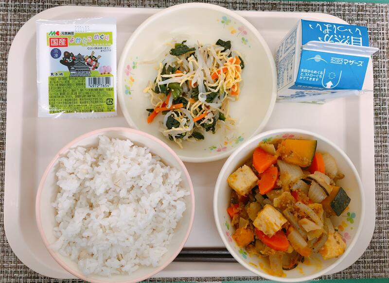 2月16日の給食は「麦ごはん、牛乳、かぼちゃのそぼろ煮、もやしのナムル、納豆」でした。