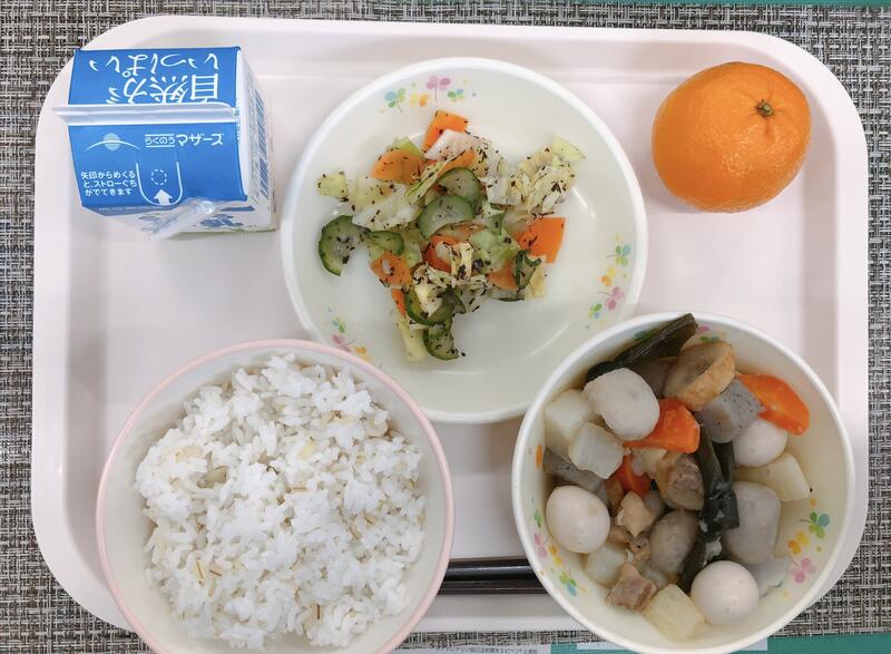 2月7日の給食は「麦ごはん、牛乳、煮込みおでん、ゆかりあえ、ぽんかん」でした。