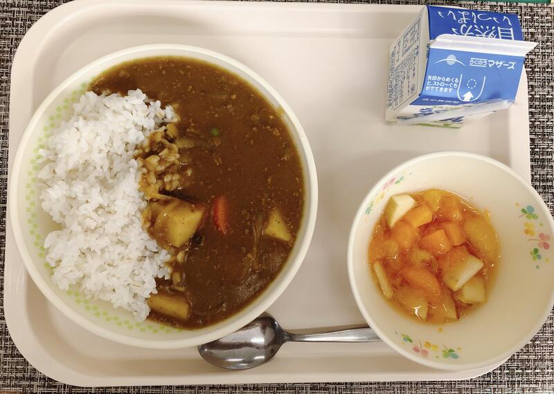 2月10日の給食は「ひき肉のカレー、牛乳、フルーツミックス」でした。