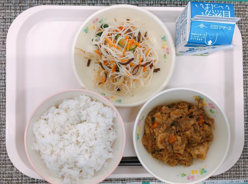 3月1日の給食は「麦ご飯、牛乳、麻婆豆腐、ビーフンサラダ」でした。