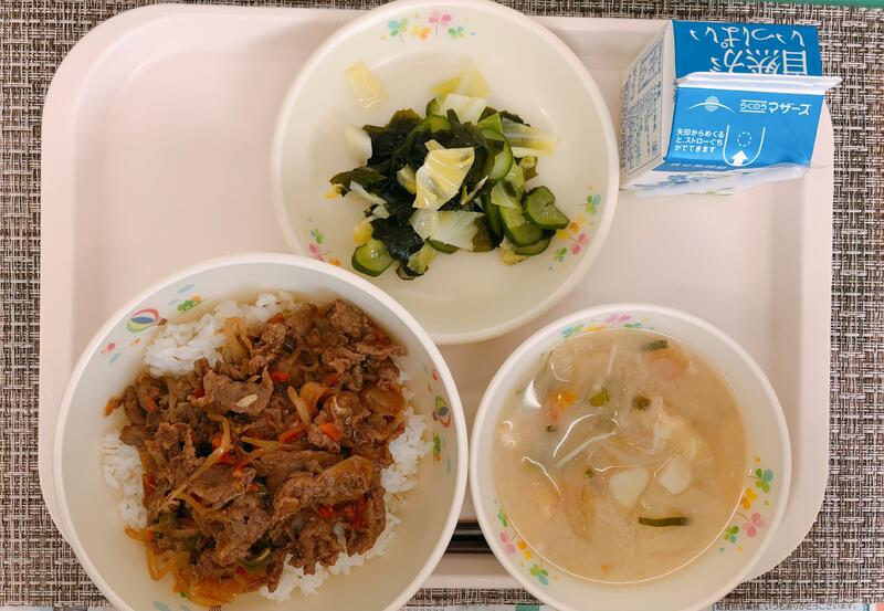 3月2日の給食は「あか牛の焼き肉丼、牛乳、みそ汁、酢の物」でした。