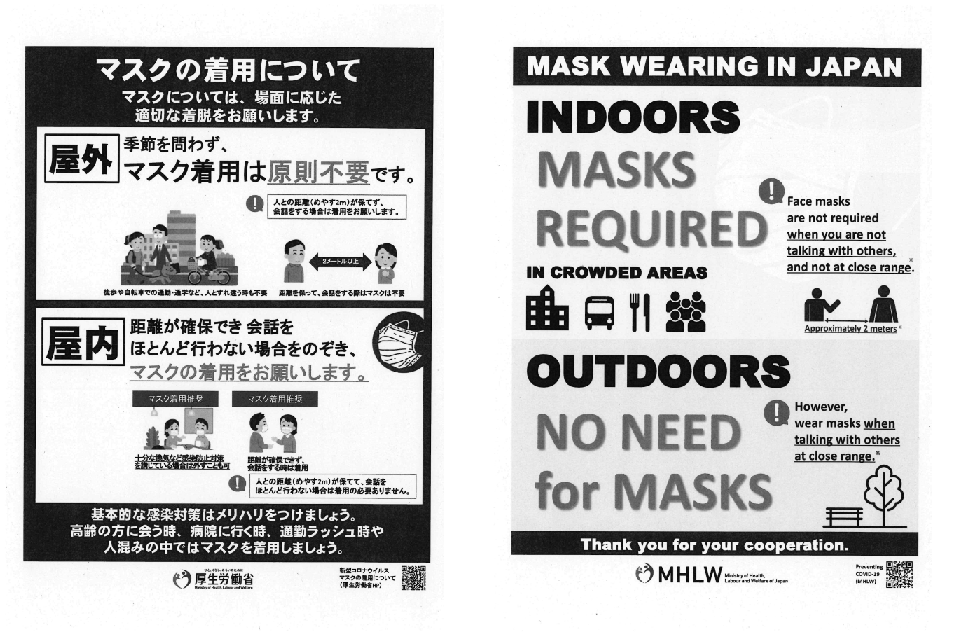 基本的な感染対策としてのマスク着用の考え方に変更はありませんが、場面に応じた適切なマスクの着脱について示されていますので、添付ファイルをご覧ください。