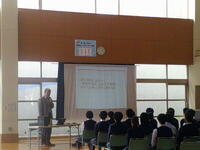 現在、3年生の総合的な学習の時間で「ようこそ先輩」として、元三角小学校の校長をお勤めされた鈴嶋聖一先生にご来校いただき、講話を行っていただいています。講話では「夢の実現に向かって」と「面接の心構え」の大きく2つのことについてお話をいただく予定です。講話のはじめで、三角小1年生時代の写真を見せていただき、懐かしい思い出と共に、改めて、自分たちの成長を実感していました。今日のこの講話を、これららの進路実現に生かせるよう先輩からしっかりと学びます。