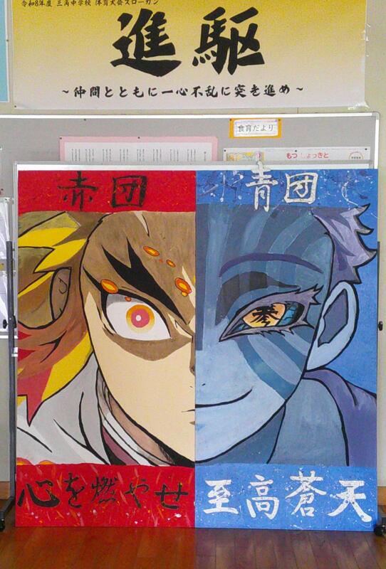 本日の6時間目、体育大会に向けた練習が行われました。そこで、全校生徒に赤団、青団の団画のお披露目会がありました。この団画は、3年生の団画リーダーが春休みから制作に取りかかり、その後、全学年のリーダーで協力し合い、ついに完成にたどり着きました。初めて見た多くの生徒から「すごい。上手。格好いい」などの称賛の言葉でいっぱいでした。いよいよ体育大会モードに突入しました。全校生徒で、今年も笑顔いっぱいで、「進駆(しんか)」し続ける三角中体育大会を創りあげていきましょう。ファイト三角中!(谷上)