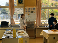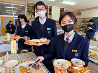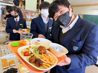 栄養教諭の鬼塚先生や給食センターの職員の皆様、教育委員会の皆様にご準備いただき、本年度も実施することができました。家庭科室の調理台に並べられた数々のごちそうに目を輝かせながら料理を盛り付け、楽しそうに食べていました。