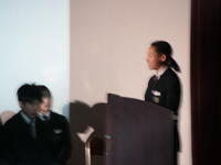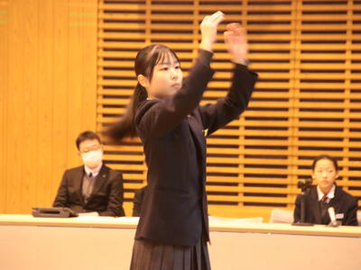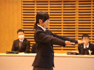 その後、個人での発表をおこないました。まず、夏休みにグローバルジュニアドリーム事業で台湾を訪問した生徒が、文化交流や学んだことの発表をしました。次に意見発表では、2名の生徒が、自分の生活の中で感じたこと、考えたことを綴った人権作文を発表しました。