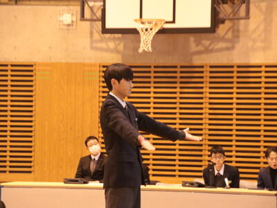 その後、議長を中心に議案の検討をおこないました。本年度の生徒会スローガンや各委員会の年間計画等が発表され、生徒全員で質問や意見を出し合いながら、よりよい学校づくりのために話し合いました。