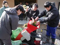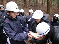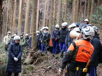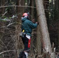 1月22日(木)の午前中に、2年生は木育学習をおこないました。役場からバスに乗り、田の原公民館に向かいました。公民館でヘルメット等の装備を身に着け、近隣の山へ。南小国町で山林の管理をされている三嶋さんから、林業の必要性や大変さなどの話をしていただき、伐採の様子を見学させていただきました。チェーンソーやワイヤーなどを使いながら思った方向に切り倒す様子に生徒たちは「すごい技だ」と感動していました。