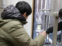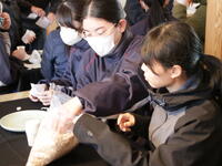 その後、Fablab南小国へ。Fablabでは、伐採されるときに切り落とされる杉の葉を使った精油づくりを見学させていただき、サシェ(香り袋)の製作を体験しました。今まで廃棄されていた杉の葉から素敵な香りのオイルを取り出したり、オイルをとったあとの葉でほうじ茶をつくったりと、1つの物を無駄なく最後まで利用されていることに生徒たちは驚いていました。