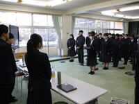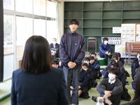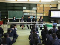 3月4日(水)の午後、本校の卒業生である5名の先輩方を講師として招き、卒業生に学ぶ会を開きました。平成9年度から28年続いている伝統の行事で、高校に通う先輩たちから、進学に向けて頑張ったことや勉強の方法、高校で頑張っていることなどを話していただきました。