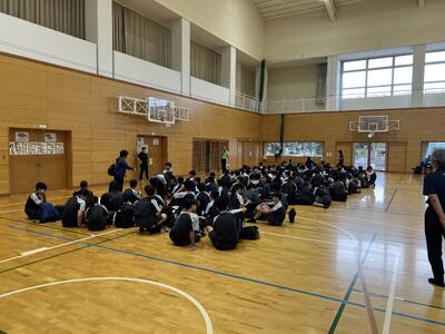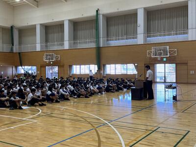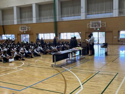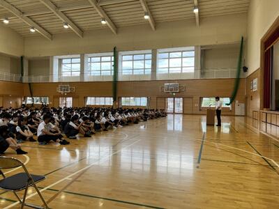 全校集会では、夏休み中の部活動の大会の表彰を行い、校長講話がありました。
