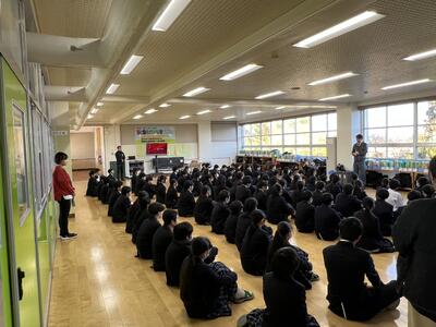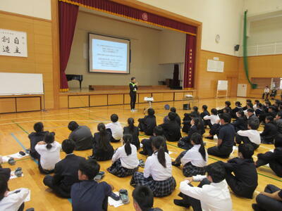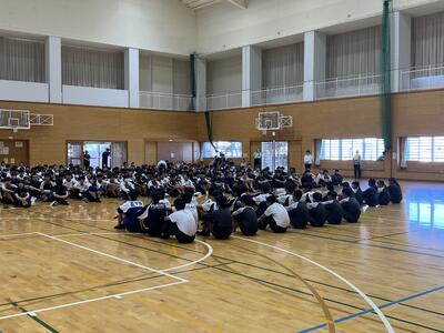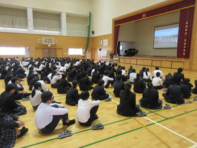 部活動の表彰、生徒会イベントの入賞者へのプレゼント、前期を振り返っての各学年の代表の発表、校長講話がありました。