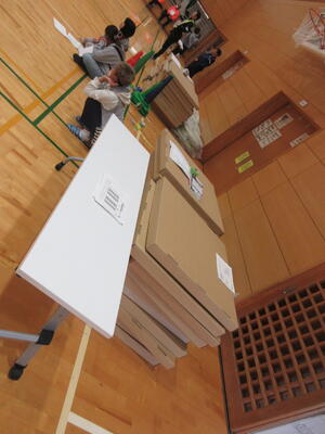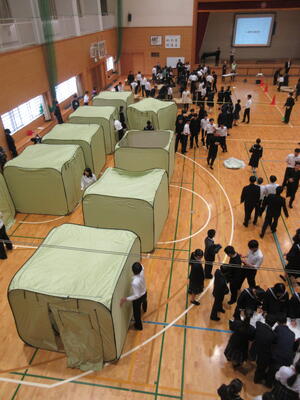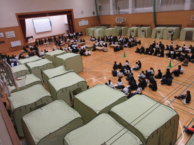 2,3年生は運営本部のメンバー10名程度をリーダーとして、テントや段ボールベットの組み立て、避難者の誘導、避難場所の選択など様々なことを考えながら避難者を受け入れました。