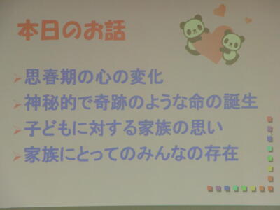 生まれてきた赤ちゃんに対する母親の気持ちや、家族の想いなどを紹介していただき、生徒たちも自分の家族のことを考えるいい時間になりました。
