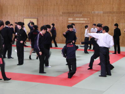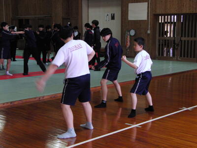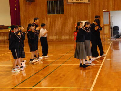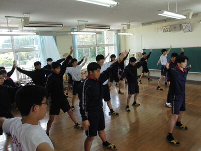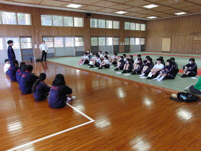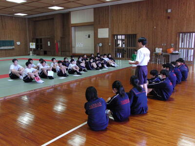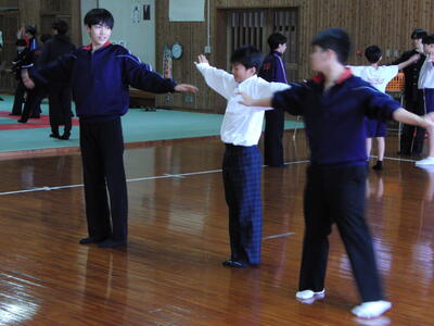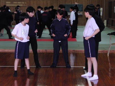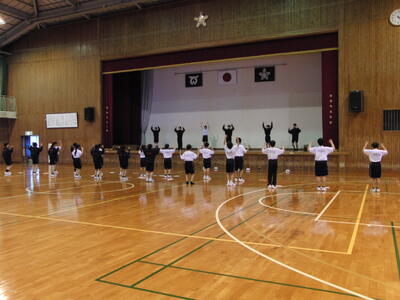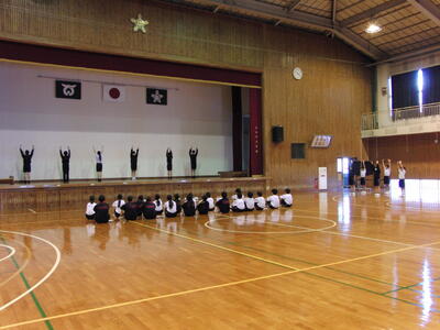 武道場では「校歌」を2年生の各リーダーが、1年生に教えていました。