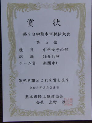 第78回熊本市駅伝大会 投稿日時 : 03/04 学校サイト管理者 2月28日(土)に、熊本県民総合運動公園で「第78回熊本市駅伝大会」が開催されました。 中学女子の部(13チーム参加)に出場し、5位に入賞しました。 今後の活躍が楽しみです。