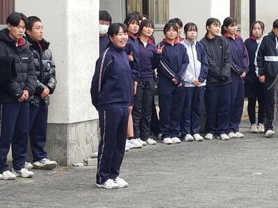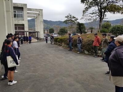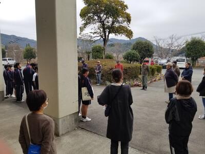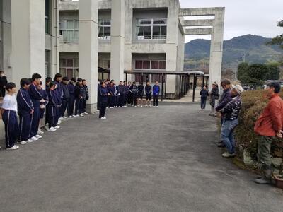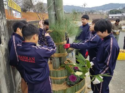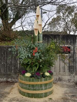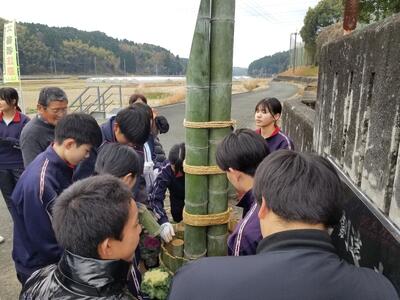 門松作り 投稿日時 : 12/15 学校サイト管理者 12月13日(土)に地域の方々に協力していただき、門松を作りました。 生徒47人、保護者15人、そして地域の7人の方々に協力していただき、正門前に立派な門松を作ることができました。 また、豚汁やおにぎりも作っていただき、門松完成後にみんなでおいしくいただきました。 材料の準備や、作り方など私たち職員や保護者の方々だけではできないこともたくさんあり、地域の方々の協力がなければ、できない行事です。本当にありがとうございました。 今後も続けていくためには、技術や知識の継承が必要です。来年もこの時期に行いますので、たくさんのご協力をお願いいたします。