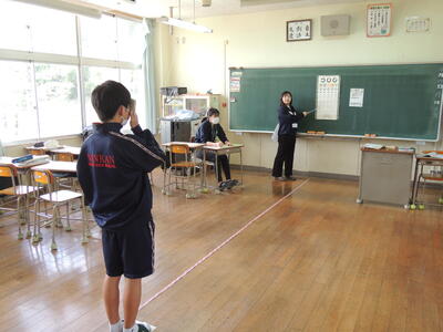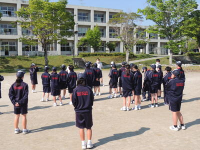 2年生が1年生にラジオ体操第2や校歌を教えてくれています。