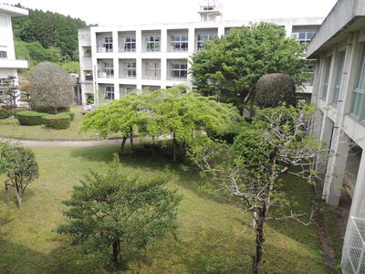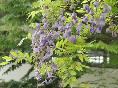 南関中学校の中庭には藤棚があり、薄い紫色の藤の花がとてもきれいです。