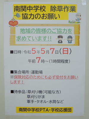 早速、5/7(日)の親子除草作業への協力のお願いのポスターを作成していただき、町内のお店など掲示していただいております。