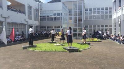 全校生徒が1、2階の教室や廊下、中庭周りを囲み、今年も4人の団長さんが中庭のセンターで挨拶と団色の抽選をしました。