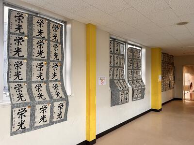廊下を通る生徒たちも足を止め、行書のしなやかさや美しさに見入っていました。