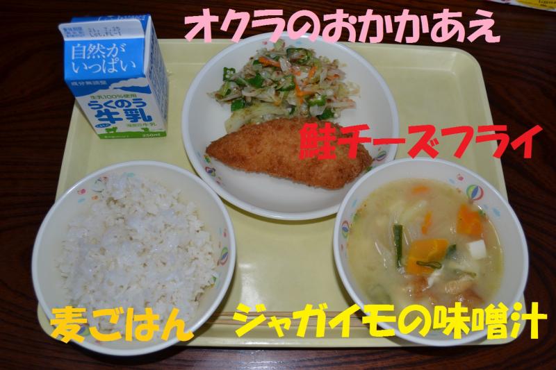 今日の給食は、麦ごはん、ジャガイモのみそ汁、、鮭チーズフライ、オクラのおかか和え、牛乳でした。今日の一番のおすすめは、鮭チーズフライでした。外はかりっと揚がっていて、中はチーズにくるまれた鮭が入っていました。チーズと鮭の相性がよくとてもおいしくいただきました。オクラのおかか和えは、食べた瞬間、口に鰹の風味がふわっと広がり、オクラの粘りとともに冷たくシャキッとしたキャベツの食感がよく、とてもおいしくいただきました。ジャガイモのみそ汁は具だくさんでした。ジャガイモが小さめに切ってあり、早めに火が通るように工夫されていたした。梅雨が明け、いきなり猛暑となりました。しっかり食べて、睡眠をとって乗り切っていきたいですね。