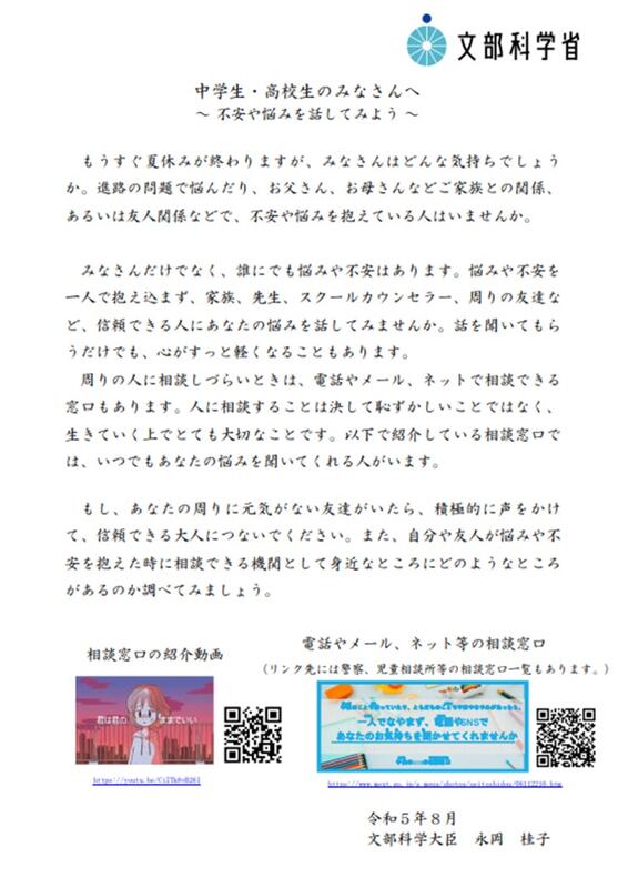 注意 児童生徒や学生等への文部科学大臣メッセージについて