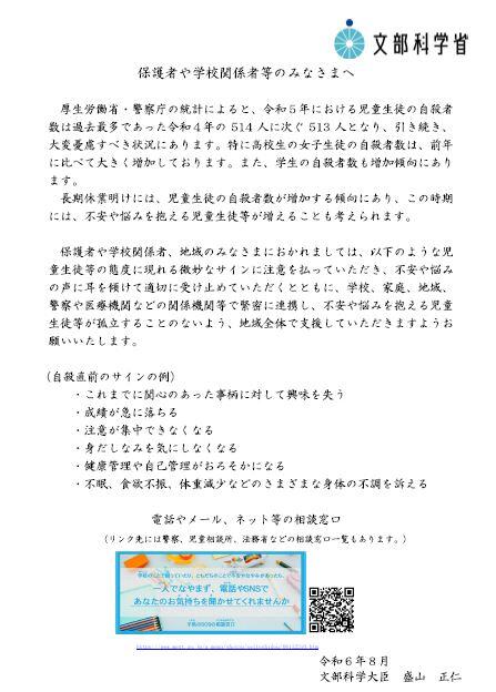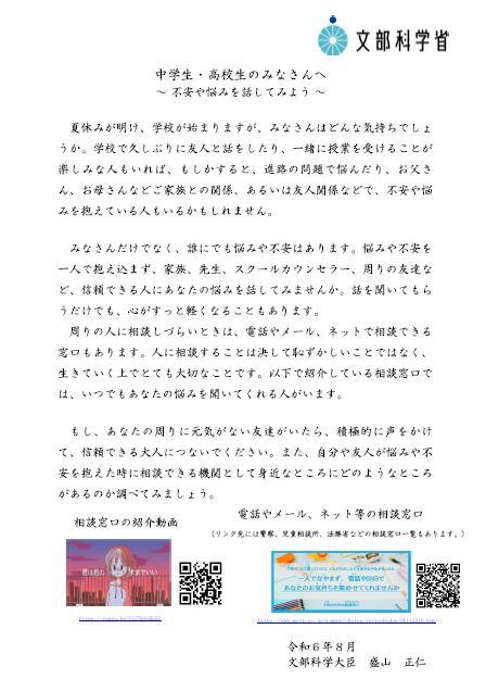 文部科学省の 盛山正仁 文部科学大臣より、生徒及び保護者の皆さんへメッセージが発信されています。
