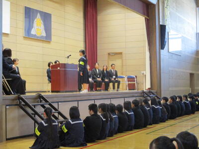 初めに、生徒会代表生徒が今年度の生徒会スローガン「邁進」に触れ、堂々と発表しました。