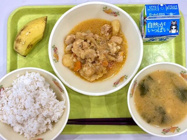 麦ごはん、牛乳、キムチスープ、チーズタッカルビ、バナナ