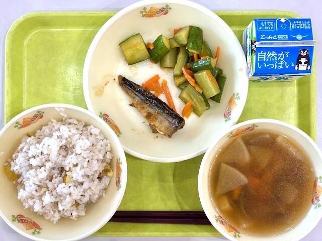 栗ごはん、牛乳、さんまの甘露煮、つぼん汁、カリカリきゅうり