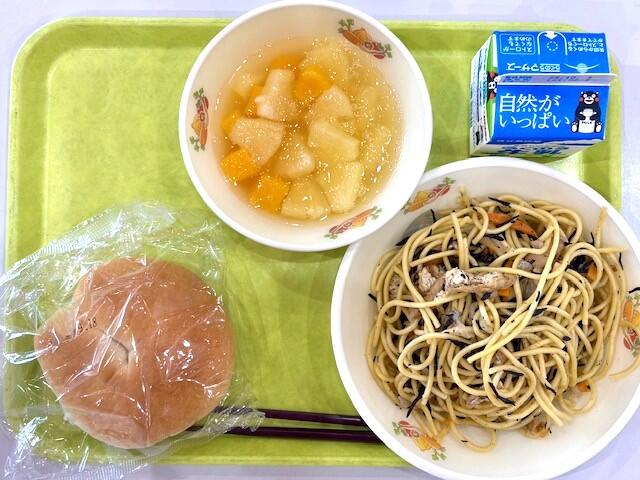 米粉パン、牛乳、ひじきスパゲティ、フルーツのジュレ和え