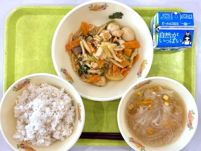 麦ごはん、牛乳、春雨スープ、プリプリ中華いため