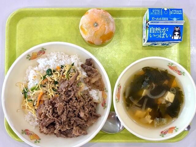 赤牛ビビンバ、牛乳、わかめスープ、冷凍みかん